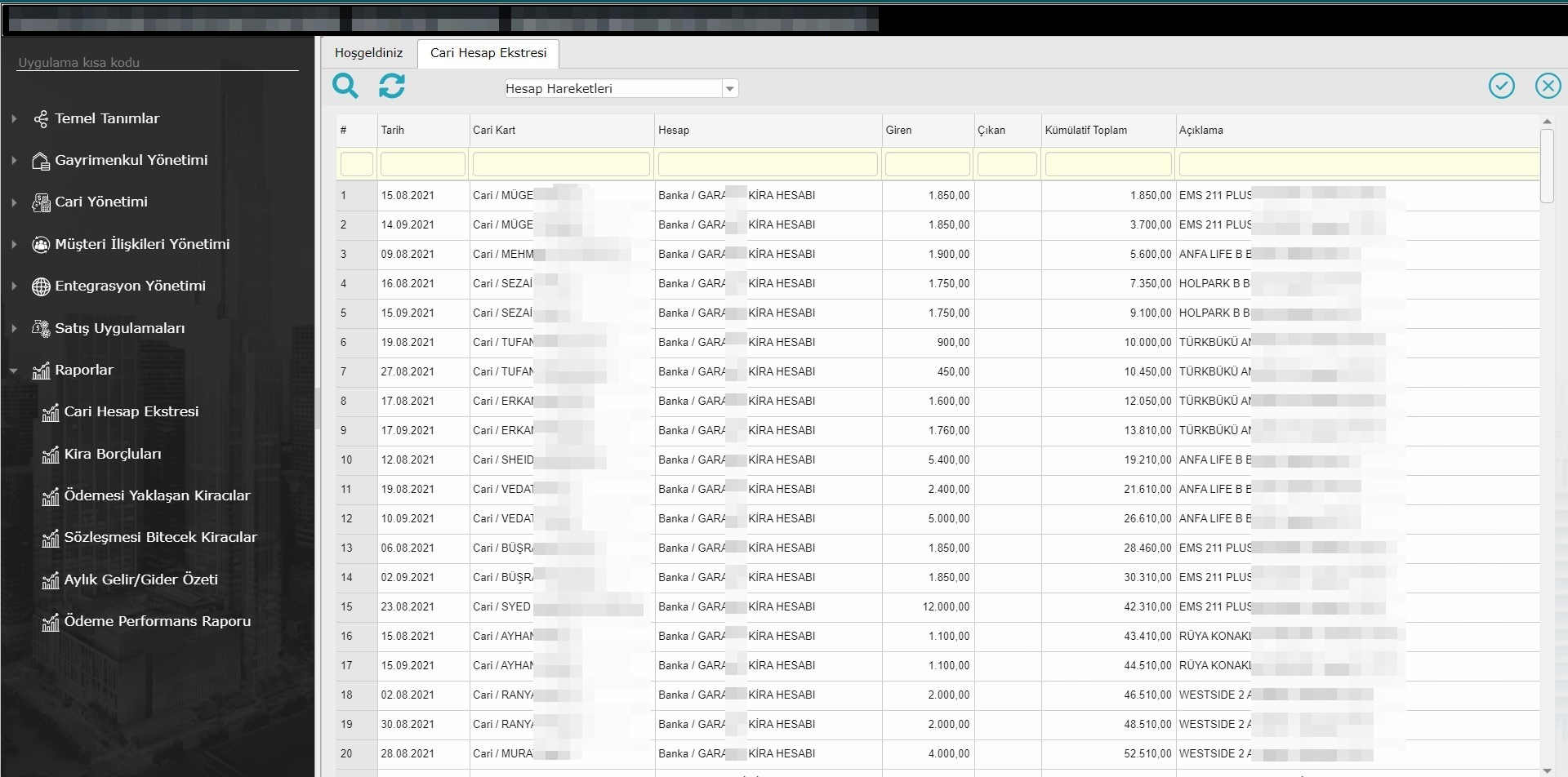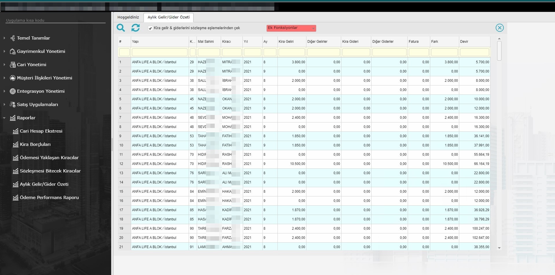 Sistem üzerine işlediğiniz veriler geniş raporlama seçenekleri ile daha anlamlı hale gelmektedir.Kira gelirleriniz üzerinden kiracı ve mülk performanslarını izleyebilir, gelir ve tüm gider kalemleriniz ekstre raporu üzerinde sunulan opsiyonlarla analiz edebilir ve diğer gelişmiş raporlama imkanlarımızdan faydalanabilirisiniz